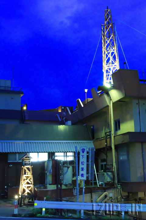 熱川プリンスホテルの国道135号に近い建物の上には「熱川プリンスホテル第一源泉」と書かれた櫓が建っています。夜間は写真の様にライトアップされて看板的な役割も果たしていそうです。