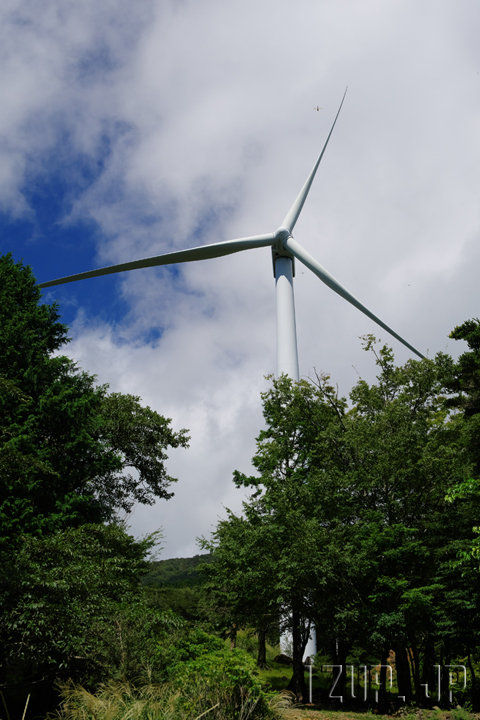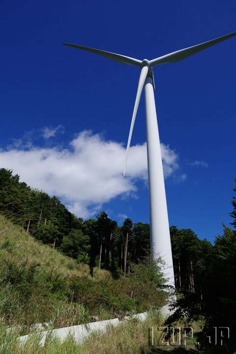 山道を登ってくると次に風車が大きく見えてくるのが6号機横です。6号機は奥にユーラス河津ウインドファーム、東電の東伊豆風力発電所を見ることが出来ます。