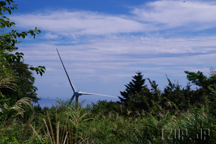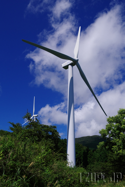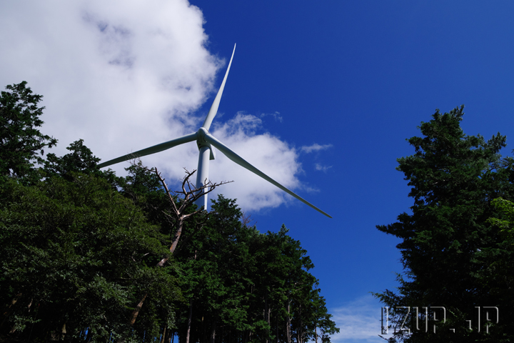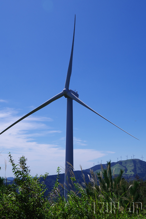 同じく5号機付近から下側を見ると7号機が見れます。ここもまた風車+伊豆諸島の写真が撮影出来るスポットです。下に2本のブレードが見えますが、左が8号機、右が9号機です。