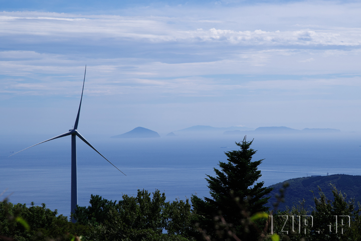 6号機横近くから9号機を見ると、奥に伊豆諸島を眺めることが出来ます。左の三角の島が利島、その横の小さな島は鵜渡根島でこちらは無人島です。右の長い島は新島、利島とに新島の間にある少し霞んでいるのが三宅島です。