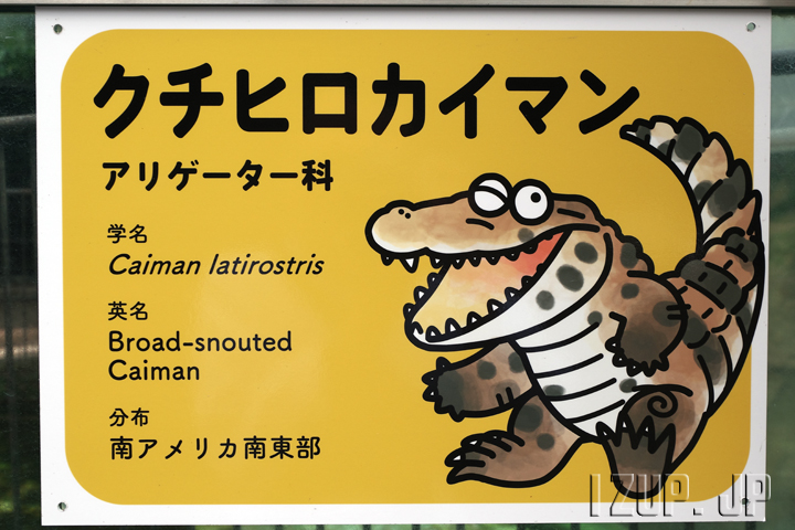 園内の案内板です。このクチヒロカイマンに限らず、園内で飼われているワニはこの様に分かりやすい案内板が掲げられています。