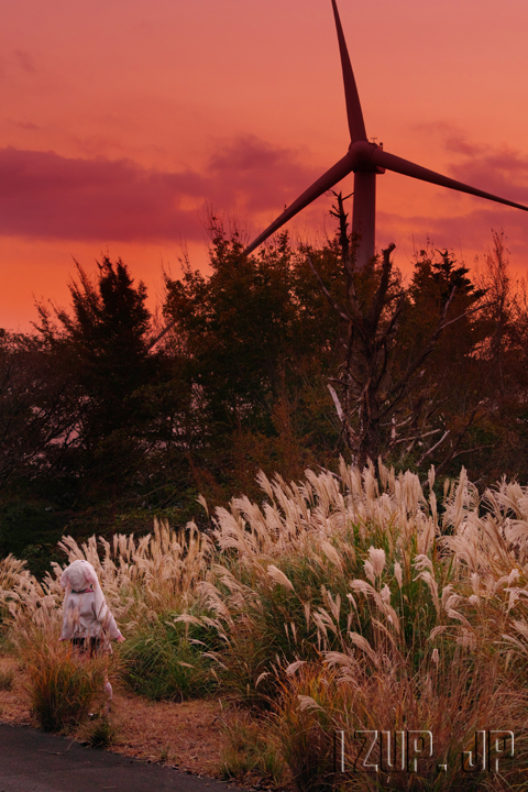 ススキの季節になりましたので、夕暮れにCEF熱川の風車と撮影してみました。
