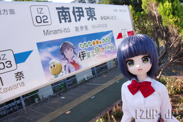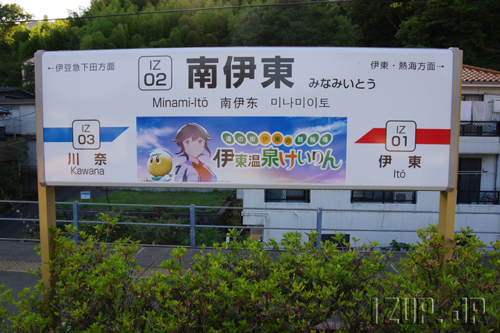 駅名標。伊東温泉競輪の施設がある為副駅名が設定され、伊東温泉競輪を舞台としたアニメ「りんかい」のイラストが掲出されています。