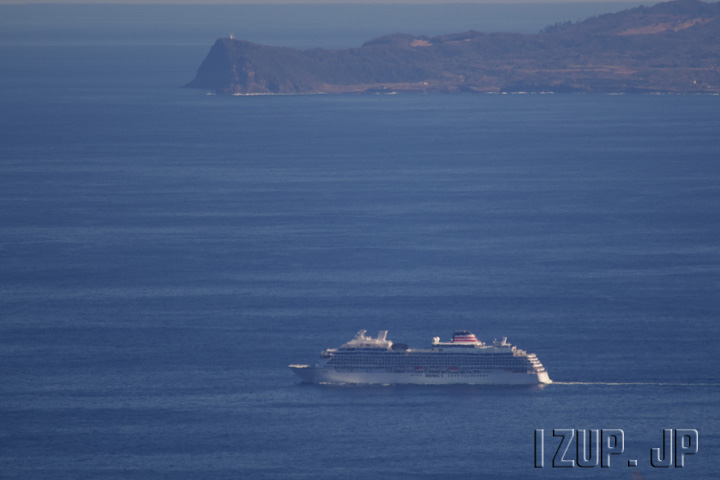 伊豆大島灯台沖を航行する飛鳥Ⅲ。2025年に就航した最新のクルーズ船です。