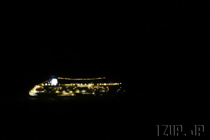 夜の東伊豆沖を行く飛鳥Ⅱ。他の貨物船と異なり各甲板ごとに煌々と明かりが灯っているので、暗闇の中でも見分けが付きやすいです。