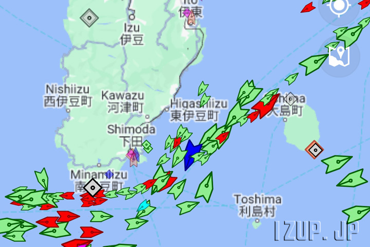 MarineTrafficのキャプチャ画面ですが、東京港を入出港する船の多くはこの様に東伊豆海岸線と大島の間を航行しています。貨物船などはひっきりなしに航行している印象で、宿泊先でバルコニーから外を見ると海辺の街に来たことを実感できます。